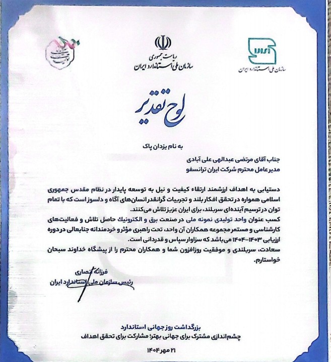 عنوان واحد تولیدی نمونه ملی، در بزرگداشت روز جهانی استاندارد توسط رئیس جمهور به گروه صنعتی ایرانترانسفو اهدا شد