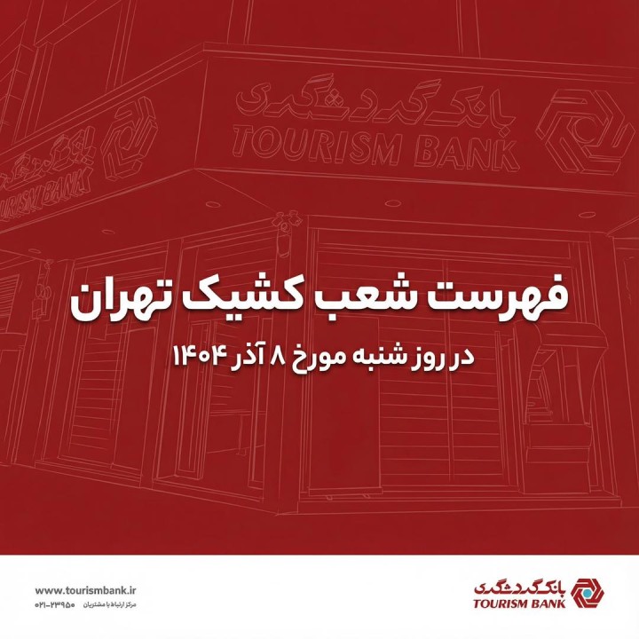 با توجه به اعلام وضعیت اضطرار آلودگی هوا در تهران و اجرای دستورالعمل مربوط به کاهش ساعات کاری دستگاهها، شعب کشیک بانک گردشگری در روز شنبه 8 آذرماه 1404 به شرح زیر از ساعت 8 تا 12 آماده ارائه خدمت به مشتریان محترم هستند: