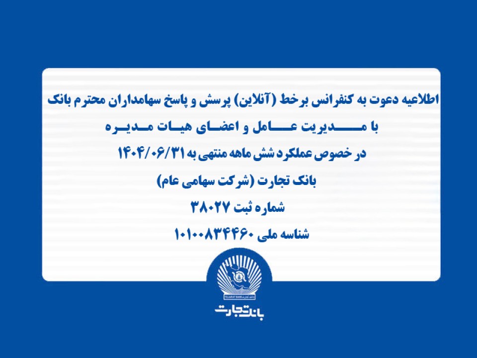 با عنایت به دستورالعمل اجرایی مدیریت نظارت بر ناشران - سازمان بورس و اوراق بهادار به شماره 122/186141 مورخ 1404/08/18؛ بدینوسیله از عموم صاحبان محترم سهام بانک تجارت برای حمایت از فعالان اقتصادی خوزستان در قالب ابزارهای تعهدی و مالی">بانک تجارت (سهامی عام) و یا نمایندگان و وکلای قانونی آنها دعوت به عمل می آید تا درجلسه کنفرانس برخط پرسش و پاسخ سهامداران محترم با مدیریتعامل و یکی از اعضای هیاتمدیره بانک که به منظور ارائه گزارش درخصوص عملکرد شش ماهه منتهی به 1404/06/31که رأس ساعت 14روز سهشنبه مورخ 1404/09/18 تشکیل میگردد، شرکت نمایند .