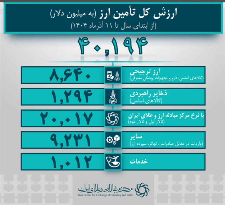 همچنین در سرفصل خدمات از جمله ارز مسافرتی، دانشجویی و درمانی هم یک میلیارد و 12 میلیون دلار ارز تأمین شده است.