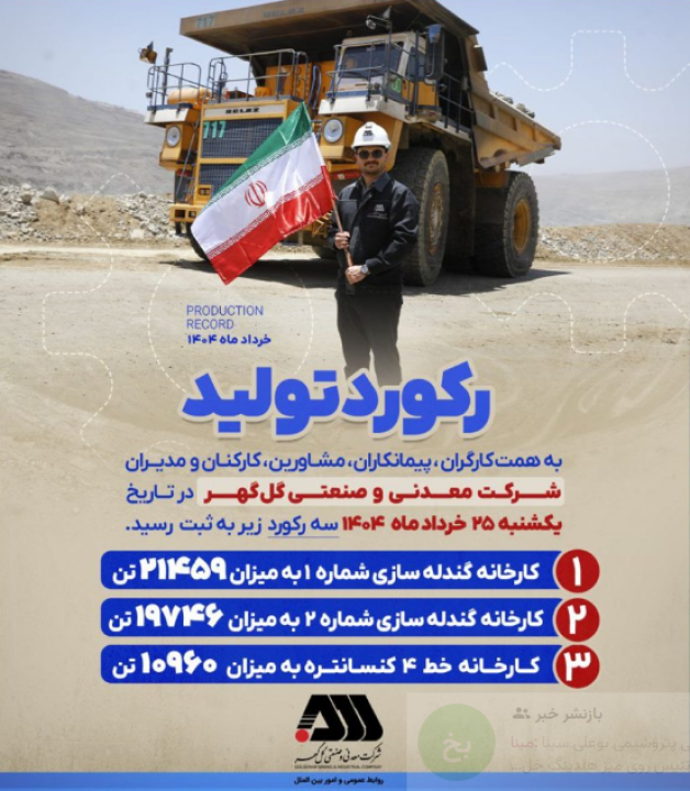 در ادامه روند روبهرشد تولید در مجموعه گلگهر، روز یکشنبه 25 خردادماه 1404 سه رکورد تازه در حوزه تولید مواد معدنی به ثبت رسید. این موفقیت حاصل تلاش مستمر و همافزایی بین کارگران، پیمانکاران، مشاورین، کارکنان و مدیران شرکت معدنی و صنعتی گلگهر است.