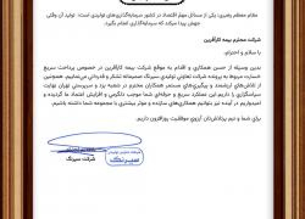 در متن این لوح، ضمن تقدیر از خدمات ارزشمند بیمه کارآفرین، بر اهمیت تداوم همکاریهای سازنده و نقش آن در پیشبرد اهداف تولید و افزایش اعتماد متقابل تأکید شده است.