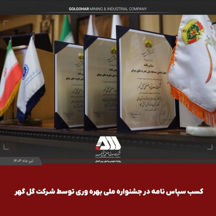 شرکت معدنی و صنعتی گل گهر در چهاردهمین جشنواره ملی بهرهوری موفق شد ۳ سپاس نامه در حوزه های بهینهکاوی، تعالی عملیاتی و نوآوری و همچنین مدیریت دارایی را دریافت کند.