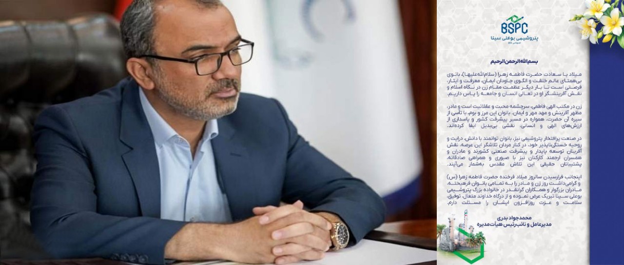 اینجانب فرارسیدن سالروز میلاد فرخنده حضرت فاطمه زهرا (س) و گرامی داشت روز زن و مادر را به تمامی بانوان فرهیخته، مادران بزرگوار و همکاران گرانقدر در خانواده بزرگ پتروشیمی بوعلی سینا تبریک عرض نموده و از درگاه خداوند متعال، توفیق سلامت و عزت روزافزون ایشان را مسئلت دارم.