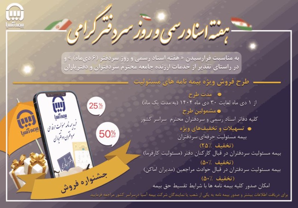 شرکت بیمه آسیا به مناسبت گرامیداشت روز سردفتر، طرح فروش ویژه‌ای را برای جامعه دفاتر اسناد رسمی کشور عملیاتی کرد. این بسته حمایتی شامل تخفیفات و تسهیلات خاص برای انواع بیمه‌نامه‌های مسئولیت حرفه‌ای، کارفرما و مراجعین است که تا پایان دی‌ماه 1404 قابل دسترسی خواهد بود. هدف اصلی این اقدام، ارتقای امنیت شغلی و پوشش ریسک‌های حرفه‌ای این قشر اثرگذار اعلام شده است.