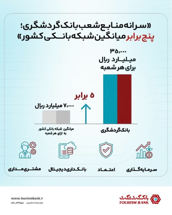 بر اساس تازه‌ترین ارزیابی‌ها، میانگین سرانه منابع در شعب شبکه بانکی کشور حدود ۷ هزار میلیارد ریال است؛ در حالی‌که این رقم در شعب بانک گردشگری به حدود ۳۵ هزار میلیارد ریال می‌رسد؛ معادل پنج برابر میانگین شبکه بانکی.